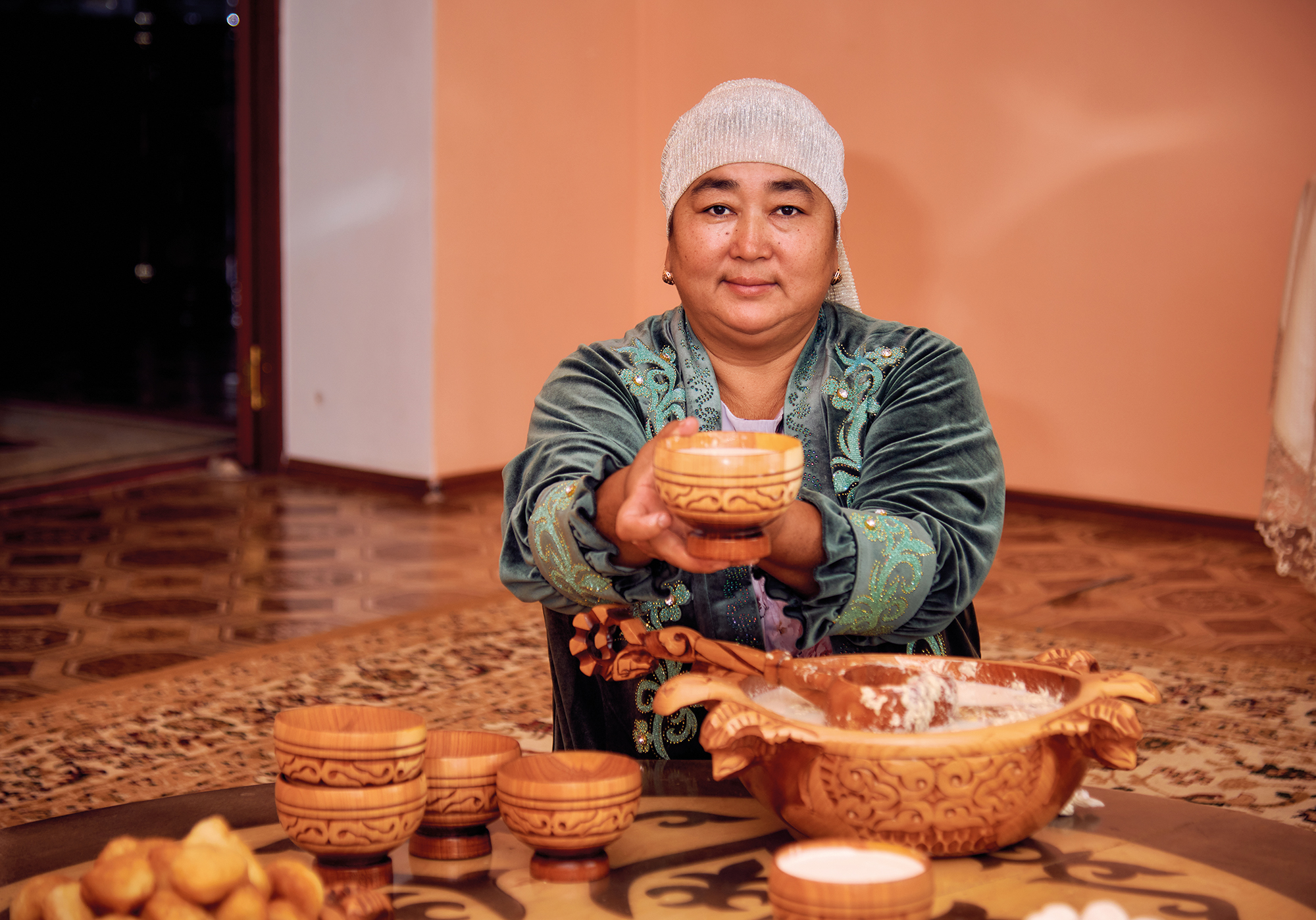 «Қымыз алыңыздар!» – деді Гүлім Өмірбекқызы да бізге қысқаша аман-сәлемнен кейін оюлы ағаш кесемен қымыз ұсынып. Жолсоқты болып жеткен біз қуана сіміріп алдық. Таныс дәм таңдайға балдай жағып барады. Тура сол – «Байқымыз» фестивалінде ішіп